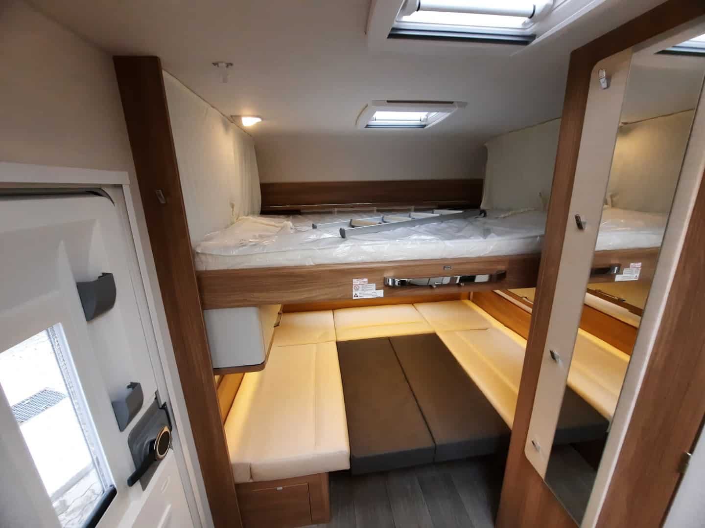 - Premio package: 12V air circulation, Midi Heki 2 roof window, entrance door mosquito net, Truma Therme water boiler, premium one-piece door with window and waste bin, LED lighting for upper cabinets,