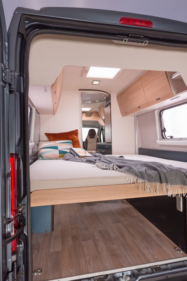 Za tylną kanapą wygospodarowano przestrzeń dla kompaktowego prysznica i łazienki z umywalką i szafkami. Naprzeciw niej ujrzymy szafę z centralnym ogrzewaniem u dołu. Tylną część kampera zajmuje dwuosobowe łóżko. Co ciekawe, zamontowano je na specjalnej windzie – dzięki czemu pod nim zmieścimy nawet dwa stojące rowery.