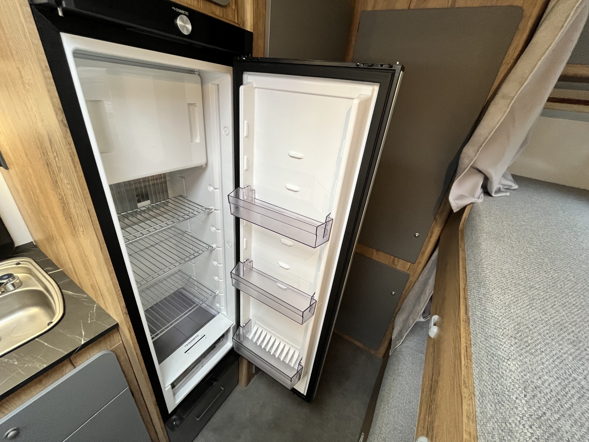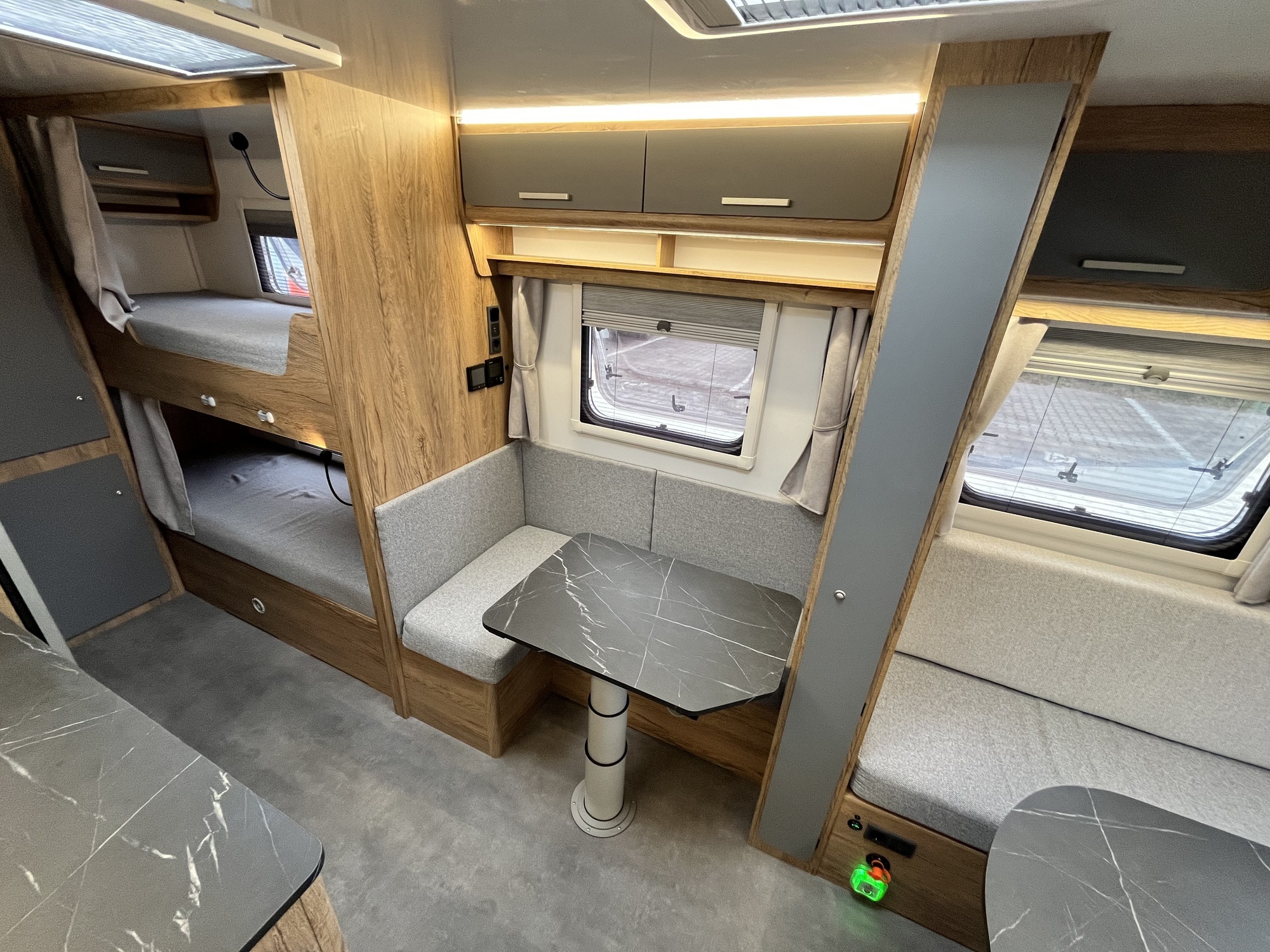 WYPOSAŻENIE STANDARDOWE obejmuje: Oś hamowana, Amortyzatory osi Al-Ko, Urządzenie najazdowe, Koło podporowe, Meble ze sklejki drewnianej, Materace i oparcia (tkanina do wyboru wg wzornika), Okna podwójne barwione (kolor do wyboru w cenie),Zasłony w oknach (tkanina do wyboru wg wzornika w cenie), Zasłony łóżek piętrowych 2 szt. (tkanina do wyboru wg wzornika w cenie), Rolety okien z moskietierą we wszystkich oknach oprócz łazienkowego, Dwa wywietrzniki dachowe Dometic Mini Heki (z roletą i moskitierą), Stopień wejściowy fiamma, Zbiornik wody czystej 30 litrów z uzupełnianiem z zewnątrz i przelewem, Kuchnia gazowa dwupalnikowa ze zlewozmywakiem Dometic HSG2445, Duża lodówka absorpcyjna 133 litry (gaz/230V/12V z auta), Łazienka z kasetą toaletową, umywalką oraz prysznicem z brodzikiem i zasłonką, Instalacja wody zimnej i ciepłej z bojlerem elektrycznym Truma Therme TT2- 5L , Akumulator 80 mAh z pojemnikiem, Zasilacz / ładowarka akumulatora z 7 fazami ładowania BC-20 PRO 20A, Ogrzewanie podłogowe 230V ze sterowaniem z termostatem, Wewnętrzne jasne oświetlenie LED, W łóżkach piętrowych 2 lampki na regulowanym pałąku z włącznikiem i gniazdem USB, 3 dodatkowe podwójne gniazdka USB, Gniazdo zapalniczkowe 12V, Lampa przedsionka LED nad drzwiami z włącznikiem, Oświetlenie drogowe LED oraz 3 światło stop